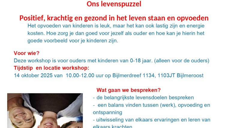 Deze workshop is voor ouders met kinderen van 0-18 jaar. (alleen voor de ouders)